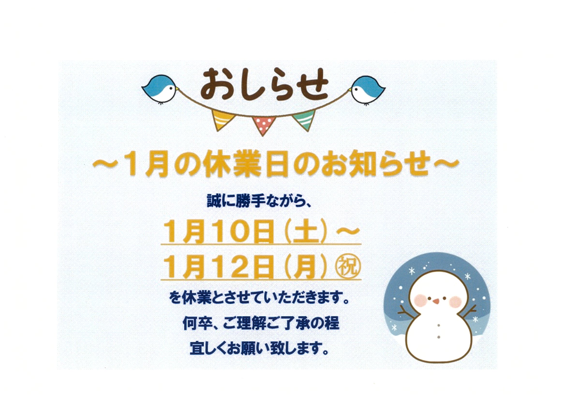 1/10(土)~1/12(月)はお休みです